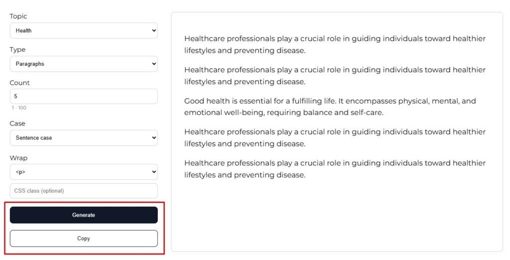 Paragraphs – Generates full blocks of text, separated by line breaks. Perfect for body copy or large content sections.